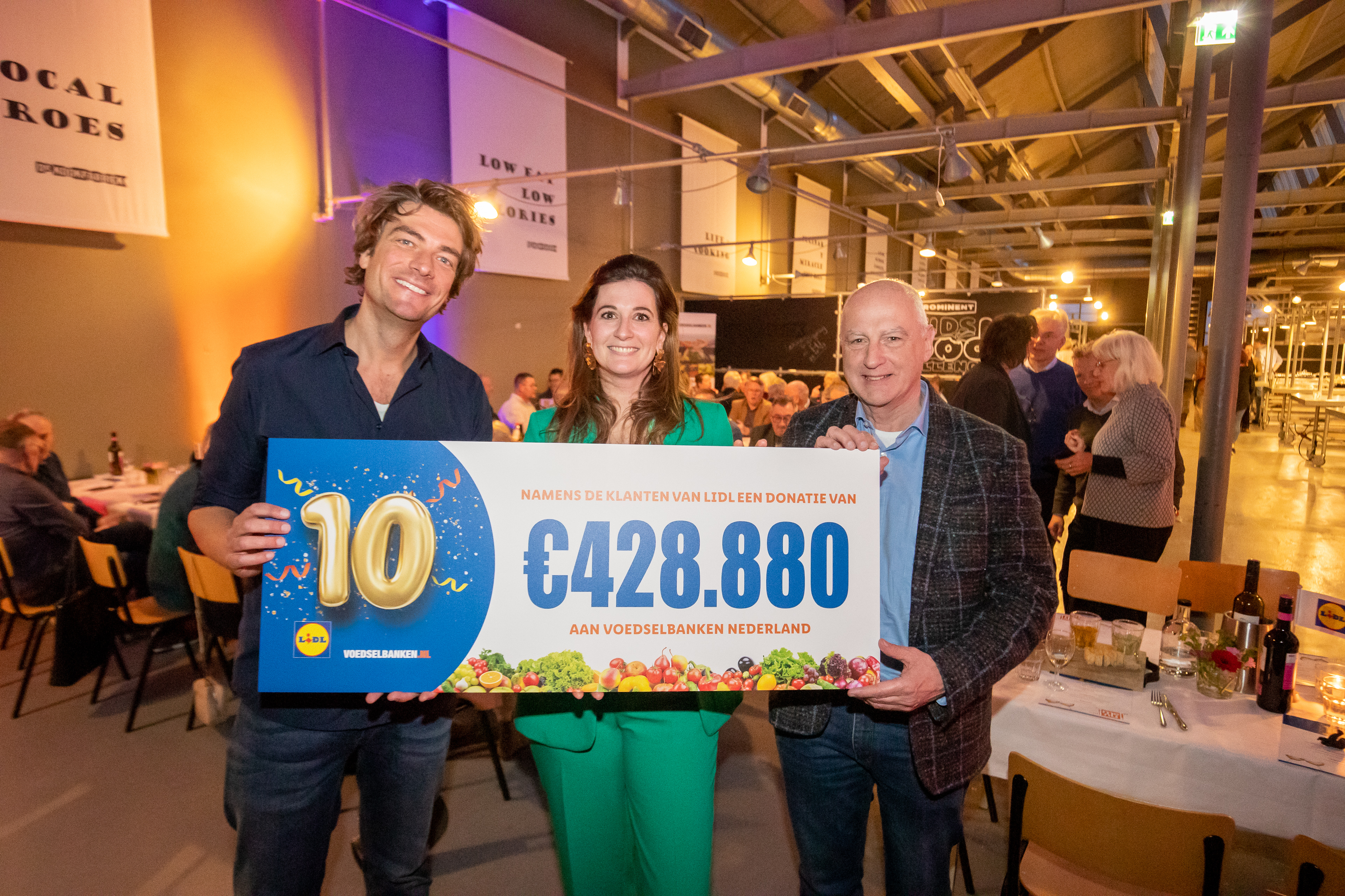 Lidl klanten kunnen Voedselbanken Nederland steunen door hun statiegeld te doneren aan Voedselbanken Nederland. Afgelopen jaar doneerden zij 428.880 euro. 538 DJ Frank Dane nam als ambassadeur van Voedselbanken Nederland de cheque in ontvangst.